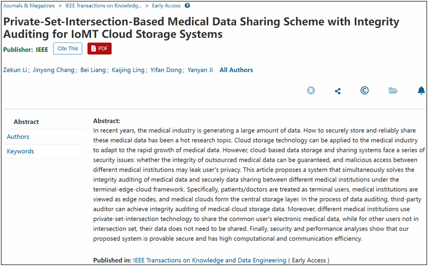 近日,我校信息与控制工程学院常金勇教授团队在国际顶级期刊IEEE TKDE(中国科学院SCI一区Top, 中国计算机学会和中国人工智能学会共同推荐的A类期刊,影响因子10.4)上发表题为“Private-Set-Intersection-Based Medical Data Sharing Scheme with Integrity Auditing for IoMT Cloud Storage Systems”(云存储环境下基于隐私集合求交的医疗数据共享与完整性审计方案)的学术论文。论文第一作者为我校硕士研究生李泽坤,通讯作者为常金勇教授,西安建筑科技大学为第一完成单位,北京大学、北京雁栖湖应用数学研究院为论文主要合作单位。