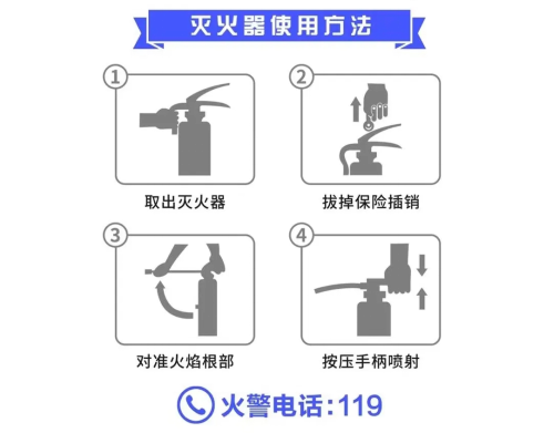 操作口诀:提→拔→握→压(提灭火器、拔保险销、握喷管、压手柄),对准火源根部喷射;