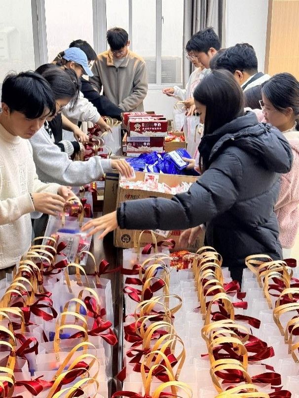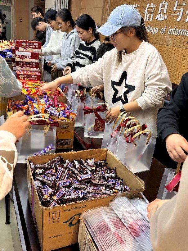 每一件物品都经过反复筛选,凝结着“陪你上岸”的心意。而这份温暖的背后,还有一段“同辈接力”的故事——活动前,学院邀请2026届保研同学担任“暖心使者”,共同参与礼包分装。他们曾是考研路上的“战友”,更懂挑灯夜读的孤独与坚持。指尖翻飞间,不仅将礼品码放整齐,更将“我们与你并肩”的信念悄悄藏进每份包裹。这份跨越年级的共情,让加油包多了一层“同路人”的温度。